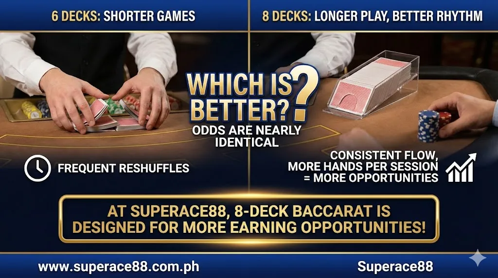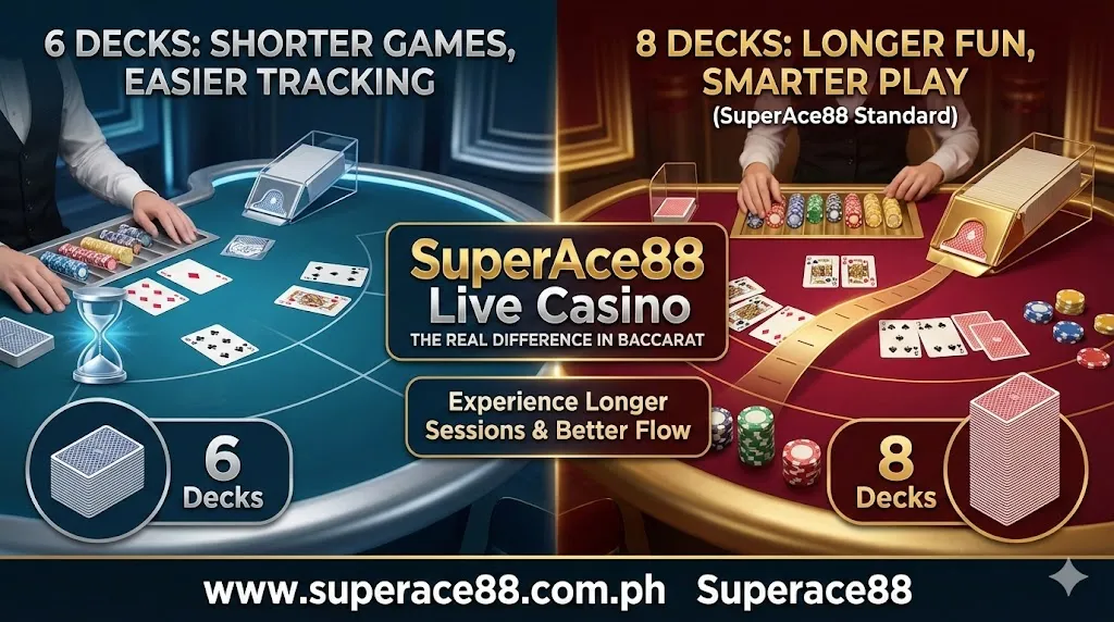 In this guide, we’ll explain the difference between 6-deck and 8-deck baccarat, how it influences the house edge, and why SuperAce88 uses 8 decks to give players more value and longer gameplay.