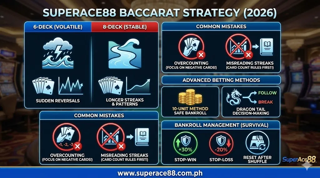 Mastering baccarat requires discipline, pattern recognition, and reliable systems. The SuperAce88 Baccarat Strategy, backed by the Fingers of the Immortal method, remains one of the most effective ways to make strategic, data-driven bets in 2026. When combined with smart bankroll management and consistent gameplay, this approach gives players a powerful edge.