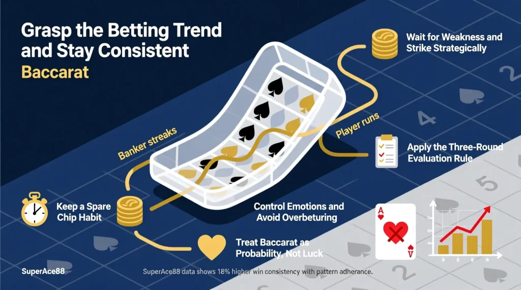 Patience is one of the most powerful baccarat skills. Instead of betting on every hand, seasoned players wait for weak or predictable phases in the shoe. SuperAce88’s data reveals that those who skip 30–40% of rounds and only bet when patterns are visible experience far greater bankroll stability.